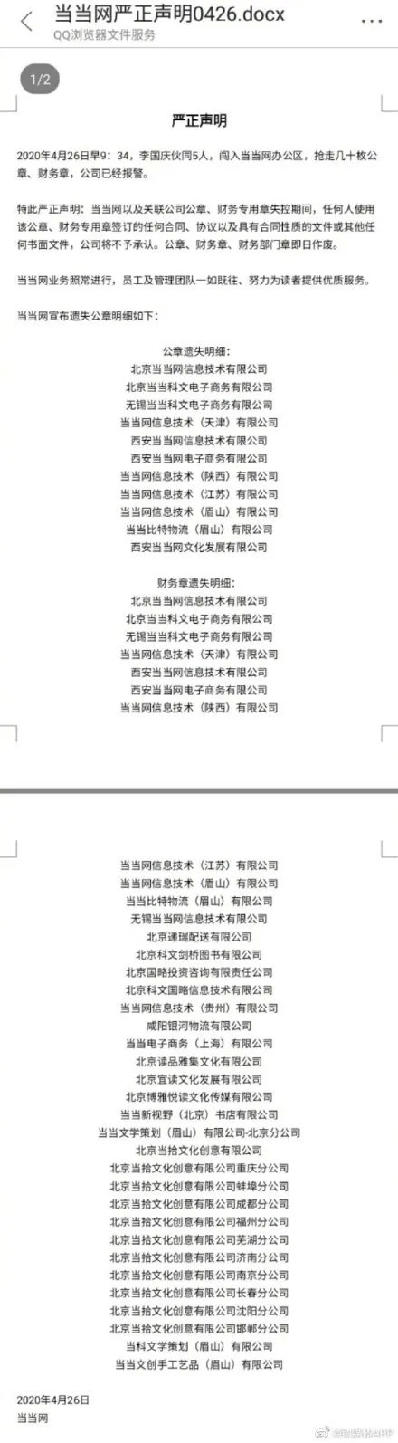 同时,当当方面表示,当当网以及关联公司公章、财务专用章失控期间,任何人使用该公章、财务专用章签订的任何合同、协议以及具有合同性质的文件或其他任何书面文件,公司将不予承认。公章、财务章、财务部门章即日作废。