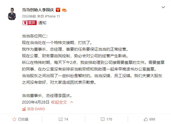 近日,李国庆抢公章、发声明,上演当当“夺权”戏码,多次登上微博热搜。今天下午,李国庆微博最新发声:当当没错,员工没错。我们夫妻大股东之间没有做好,对大家造成困扰表示歉意。李国庆表示,我作为董事长,总经理,首要的任务要保证当当的正常经营。现在公章、财务章由我控制,势必会对公司的经营产生影响。
