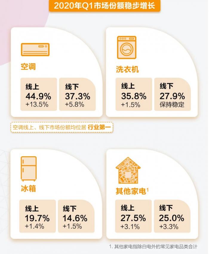 据奥维云网监测数据,1-3月,美的空调、洗衣机、冰箱以及其他家电产品的线上线下市场份额均有稳步增长。