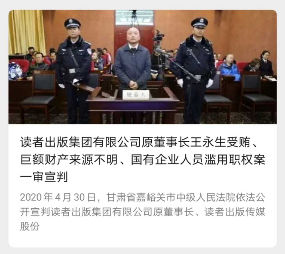 被控受贿超千万,读者出版集团原董事长王永生一审获刑14年。