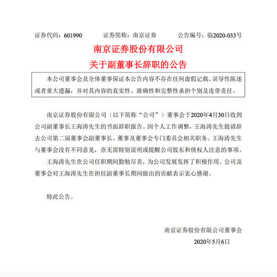 南京证券公告表示,董事会于2020年4月30日收到公司副董事长王海涛先生的书面辞职报告。因个人工作调整,王海涛先生提请辞去公司第二届董事会副董事长、董事及董事会专门委员会相关职务。
