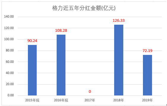 从近五年分红数据看,格力电器在2019年分红出现了明显的收紧,除去2017年没有分红之外,2019年分红是近五年最低的分红金额。