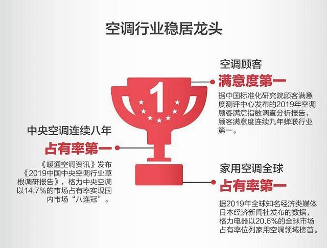 2019年,格力电器上榜《财富》“世界500强”榜单,位列第414位。在上榜的129家中国企业中,格力电器的净资产收益率居于首位。在中国标准化研究院顾客满意度测评中心等机构联合发布的“2019年10类家电产品顾客满意度调查”中,格力电器凭借卓越的产品和优质的服务连续八年蝉联空调品类顾客满意度第一位。业内专家表示,格力电器始终坚持自主创新、追求精工品质,不断凭借卓越的技术和优质的产品引领行业发展,为中国品牌在国际范围内赢得更多的美誉度和话语权。