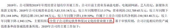 在2019年报中,看看北京文化怎么说的。北京文化暴亏23亿,仅世纪伙伴、星河文化的商誉减值就接近15亿。