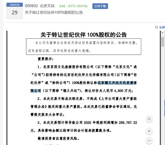 然而,就在4月29日娄晓曦实名举报前,北京文化公告称,拟将持有的世纪伙伴(文化传媒)100%股权转让给北京福义兴达文化发展有限公司。