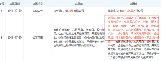 扒一扒,北京福义兴达文化发展有限公司前身是北京福义兴达商贸有限公司,注册资金101万,此前是从事销售机械设备、文具用品、纸制品的商贸公司。2019年7月才变更企业名称,加了一堆文化交流、影视策划、公共关系服务等经营范围。