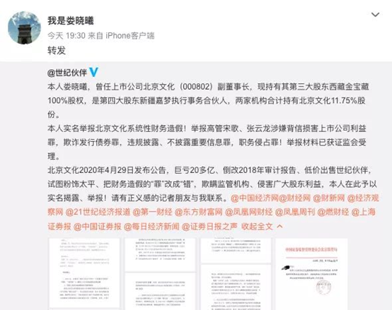 娄晓曦称,北京文化2020年4月29日发布公告,巨亏20多亿、倒改2018年审计报告、低价出售世纪伙伴,试图粉饰太平、把财务造假的“罪”改成“错”,欺瞒监管机构、侵害广大股东利益。