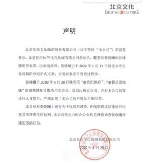 4月29日,娄晓曦以北京文化原副董事长的名义发文,向证监会举报北京文化系统性财务造假,董事长宋歌与公司副总裁张玉龙涉嫌“损害上市公司利益罪,欺诈发行债券罪,违规披露、不披露重要信息罪,职务侵占罪”,并附上了向证监会、深交所递交的“举报信”部分截图。