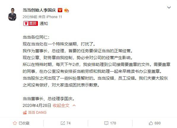 当当创始人李国庆今天下午在微博发通知称,现在公章、财务章由他控制,势必会对当当经营产生影响。因此," 每天下午 2 点,我安排助理到公司接需要盖章的文件。需要盖章的同事,在办公室没有安排妥当前劳烦和我助理一起来早晚读书办公室盖章。"