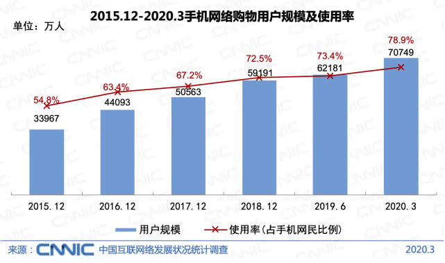 截至2020年3月,手机网络购物用户规模达7.07亿,较2018年底增长1.16亿,占手机网民的78.9%。