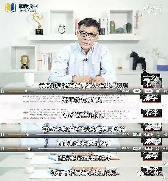 4月22日,李国庆在视频节目《言之有李》中表示,听说当当要裁员100多人,很多自己招的,或者得到过自己的总裁认同奖的员工也在被裁之列。