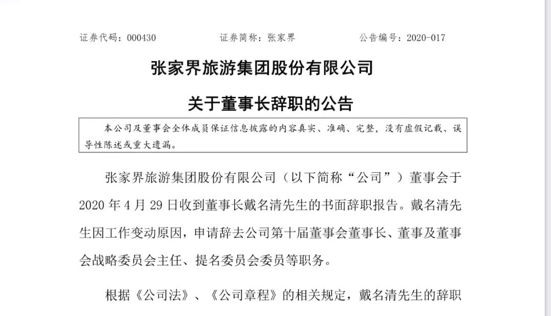 5月2日下午,张家界迅速发布公告,称已于4月29日收到董事长戴名清的书面辞职报告。