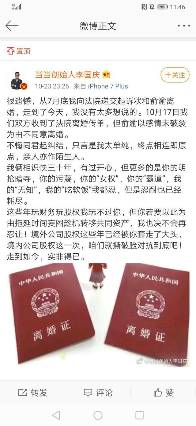 2019年10月23日晚间,当当董事长俞渝在李国庆朋友圈留言,称“你绑架我二十年,我受够了”、“要抓破你的脸。”