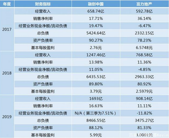 从两家公司的数据中,我们可以看到融创虽然然一直买不停,而且负债率是偏高的,但总体财务管控尚属良好,销售能力极强,经营收入同比增长速度比富力高很多。融创2019经营收入等于2017年经营收入的2.6倍,而同期的富力仅为1.5倍,从这里就可以看出孙宏斌的资本运作能力及融创的销售能力比富力好太多了。