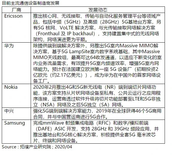 业内人士表示,华为、爱立信(ERIC.US)、诺基亚、三星、中兴(00763)等设备商当前都在积极推出端对端(end-to-end)解决方案抢攻市场,并持续提升网络功能与特性。
