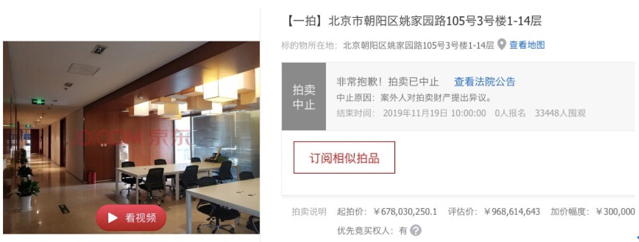 原本可在今日(11月19日)迎来新主人的乐视大厦被中止拍卖,理由是“案外人对拍卖财产提出异议”。