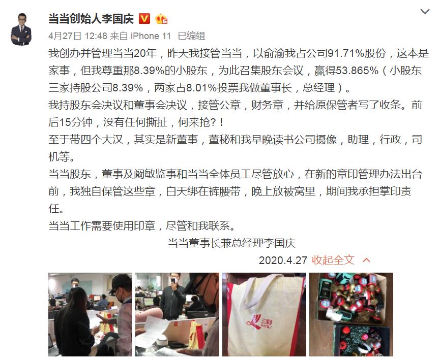 4月27日午间,李国庆在个人微博回应称,“昨天我接管当当,以俞渝我占公司91.71%股份,这本是家事,但我尊重那8.39%的小股东,为此召集股东会议,赢得53.865%(小股东三家持股公司8.39%,两家占8.01%投票我做董事长,总经理)。”