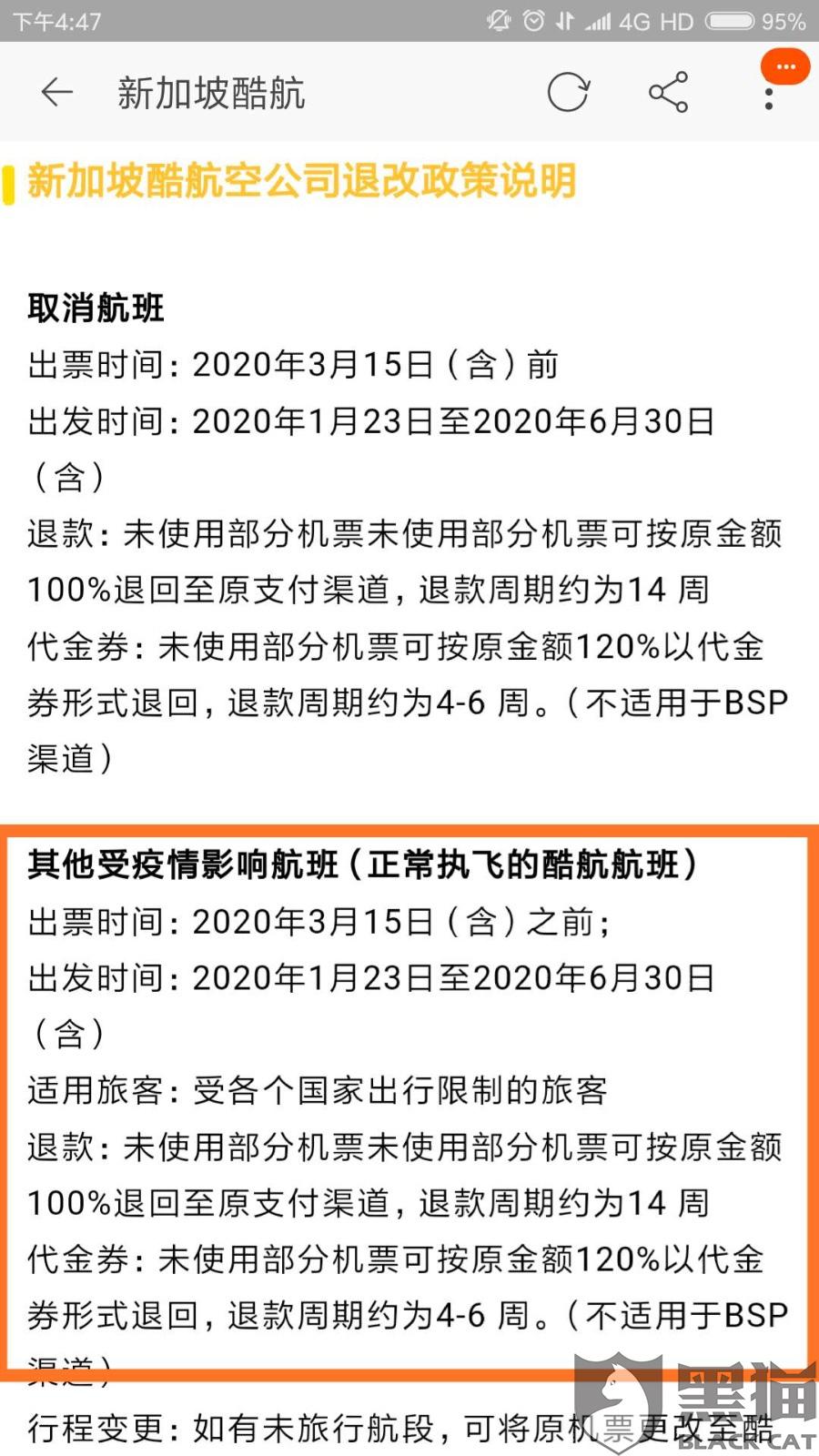 消费者“匿名”在5月5日向黑猫投诉平台反映:“我所购买的机票新加坡酷航空公司,已经发布了退改政策在飞猪平台,且机票出票时间及出发时间全部符合全额退票条件,但屡次退票被驳回。拨打商家电话,一直忙线,或者不接电话。如果起飞前都没有受理要如何保障消费者权益。 目前在多个平台,都有看到这家店铺最终不了了之没有给消费者合理解决问题,导致消费者钱财损失的情况。希望能够合理解决消费者的诉求,毕竟机票所在航司和平台,即新加坡酷航空和飞猪平台都已经出具相关政策,店家不要逃避问题。否则坚决投诉到底!”