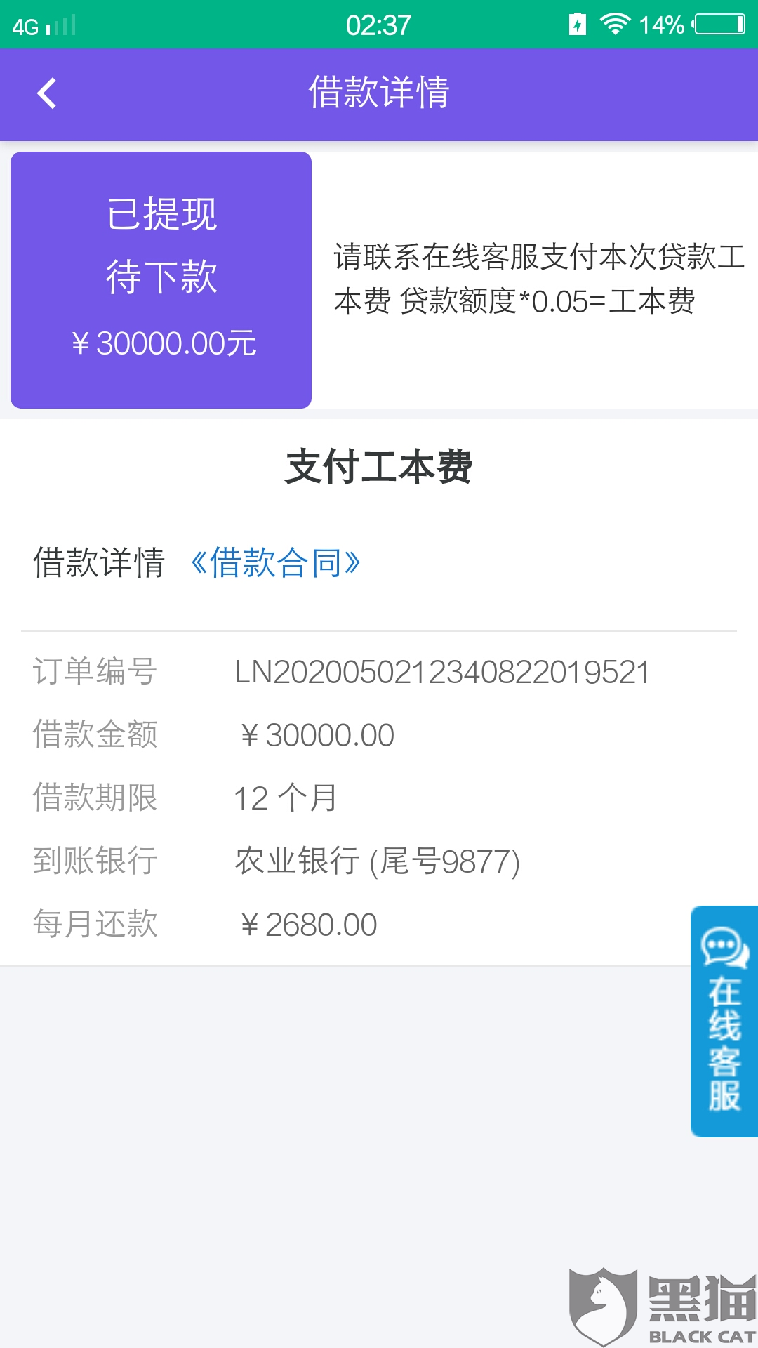 消费者“用户7450264495”在5月5日向黑猫投诉平台反映:“微粒贷,钱下款到钱包里又取不出来,还要交工本费。里面就显示要还款了。联系客服都隐藏去,找不到,又退不了款 ,钱还没到本人帐号,还要收利息费”