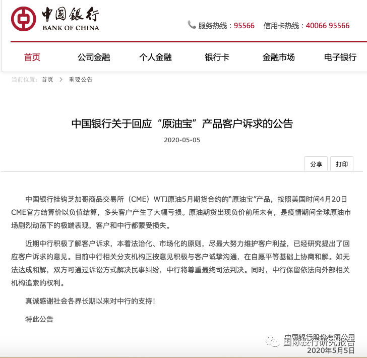 中国银行关于回应“原油宝”产品客户诉求的公告