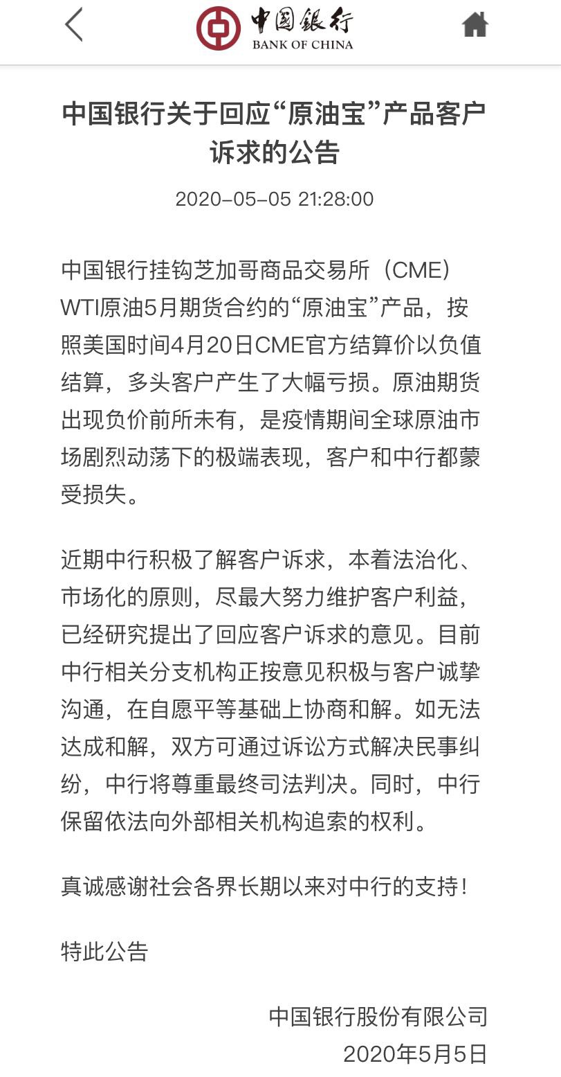 据悉,中国银行挂钩芝加哥商品交易所(CME)WTI原油5月期货合约的“原油宝”产品,按照美国时间4月20日CME官方结算价以负值结算,多头客户产生了大幅亏损。中国银行表示,原油期货出现负价前所未有,是疫情期间全球原油市场剧烈动荡下的极端表现,客户和中行都蒙受损失。