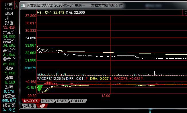 阅文集团4月29日收跌4.65%,5月4日收报32.00港元/股,跌8.18%,截至5月6日10时38分,报34.00港元/股,涨2.72%。