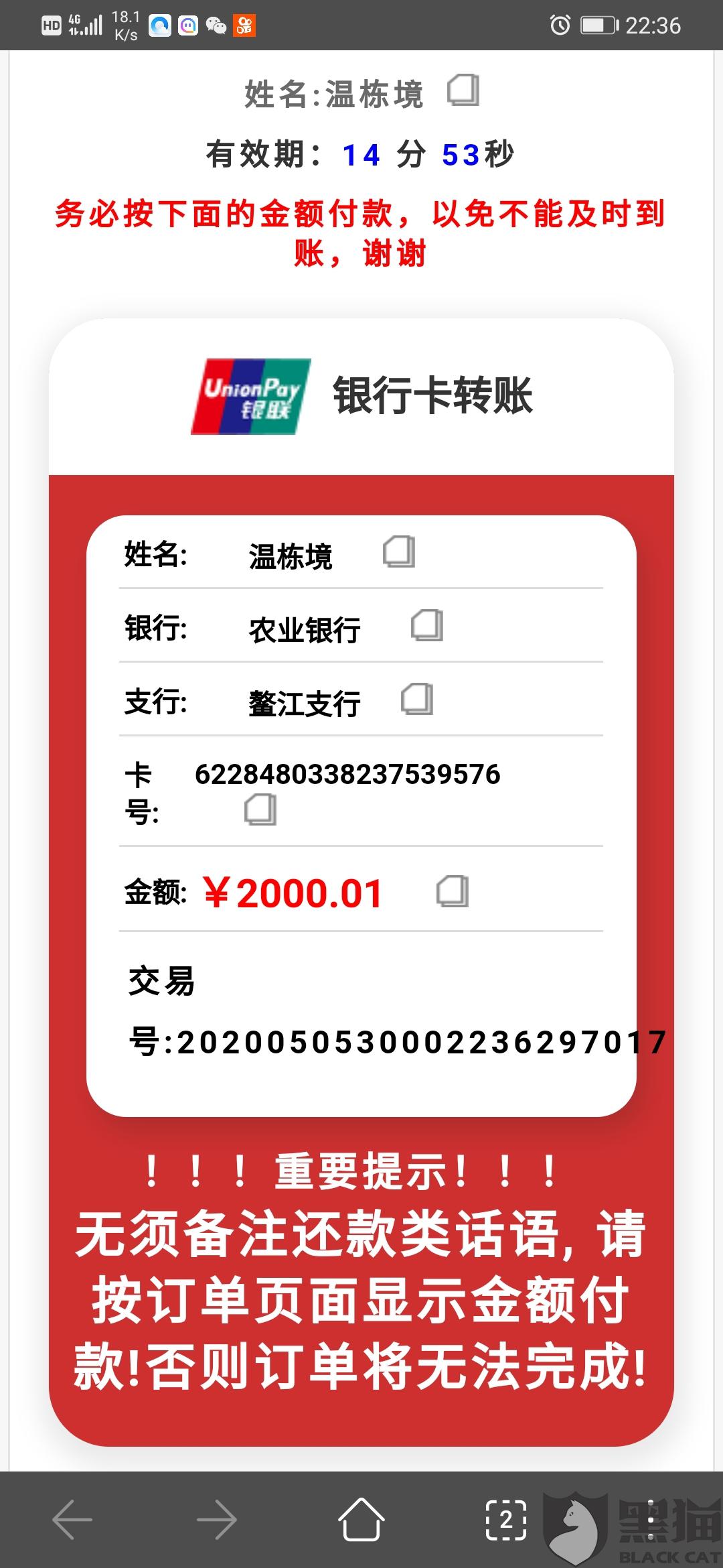 消费者“匿名”在5月5日向黑猫投诉平台再次反映:“他钱直接转到我卡上了,我直接还给他,要衢州这边交易”