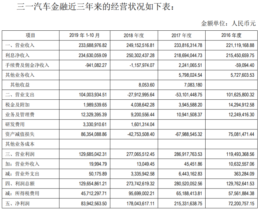 公告同时披露三一汽车金融财务数据。自2016年至2019年1-10月,三一汽车金融营收分别为2.21亿、2.34亿、2.49亿、2.34亿,净利润分别为7220.08万、2.15亿、1.78亿、8394.26万。虽营收变化较为稳定,但自2017年起其净利润却逐年下滑。2018年净利润同比降17%,2019年前10个月净利润尚不足2018年全年净利润的一半。