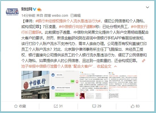 IT之家5月7日消息 财经网消息,此前池子曝光称中信银行私自泄露自己的个人账户交易信息,中信银行官方也已就相关事件道歉并将中信支行行长撤职,相关话题也已登顶微博热搜。有律师就此事作出了分析。