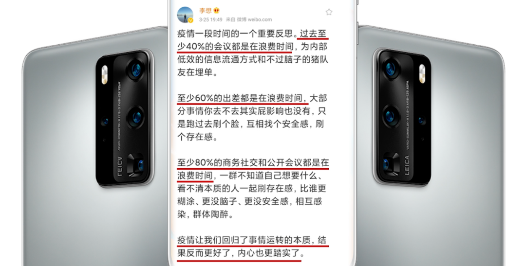 “过去至少40%的会议、60%的出差、80%的商务社交和公开会议都是浪费时间,疫情让我们回归了事情运转的本质,结果反而更好了,内心也更踏实了。”
