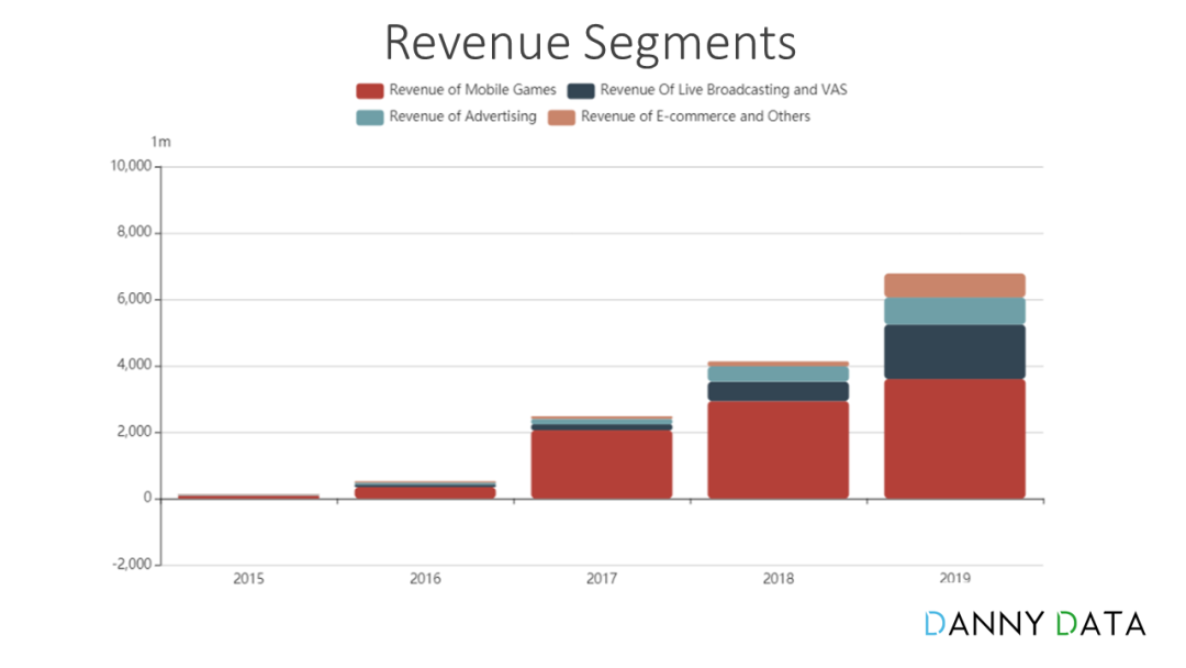 先说B站,我们可以从DannyData看出B站2019全年的手游收入仍然占整体收入的大头,占比53%。其次是直播和增值业务,指的就是你们熟悉的冯提莫和大会员,占比24%;之后是广告收入占比12%,其余11%是电商与其他收入。