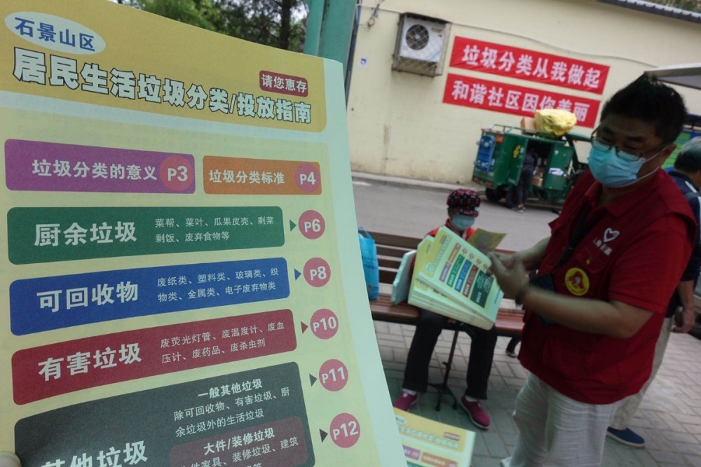 5月7日,石景山区八角街道八角北里社区的工作人员为居民发放《居民生活垃圾分类/投放指南》,指导居民开展垃圾分类。“这本14页的垃圾分类指南讲解的很细致,里面有垃圾分类的意义,还有垃圾分类的标准,图文并茂的形式非常适合居民合理分类垃圾。