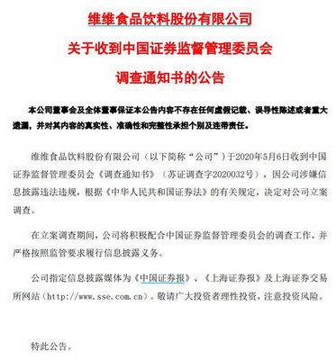 5月6日晚间,维维股份公告称,收到中国证券监督管理委员会《调查通知书》(苏证调查字2020032号),因公司涉嫌信息披露违法违规,根据《中华人民共和国证券法》的有关规定,决定对公司立案调查。