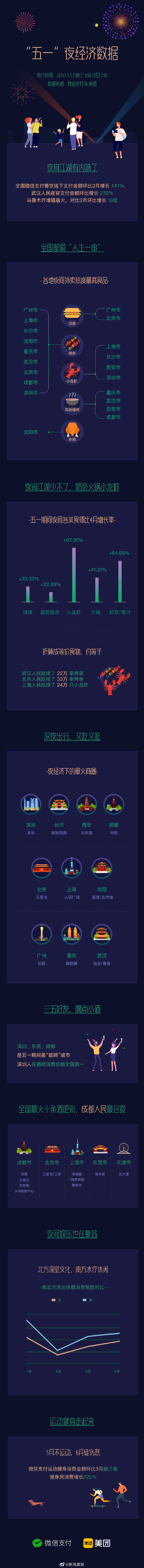 5月5日,微信和美团联合发布《“五一”夜经济数据》,数据显示,五一小长假期,微信支付线下消费总额较3月环比增长30%,目前已恢复并超过去年12月的消费水平;烤串成为武汉、广东、上海、深圳等多城市美团用户最爱的夜间外卖,五一前3天北京吃掉33万串烧烤 五一前3天上海吃掉24万只小龙虾 深圳、东莞、成都成全国“最能喝”城市。