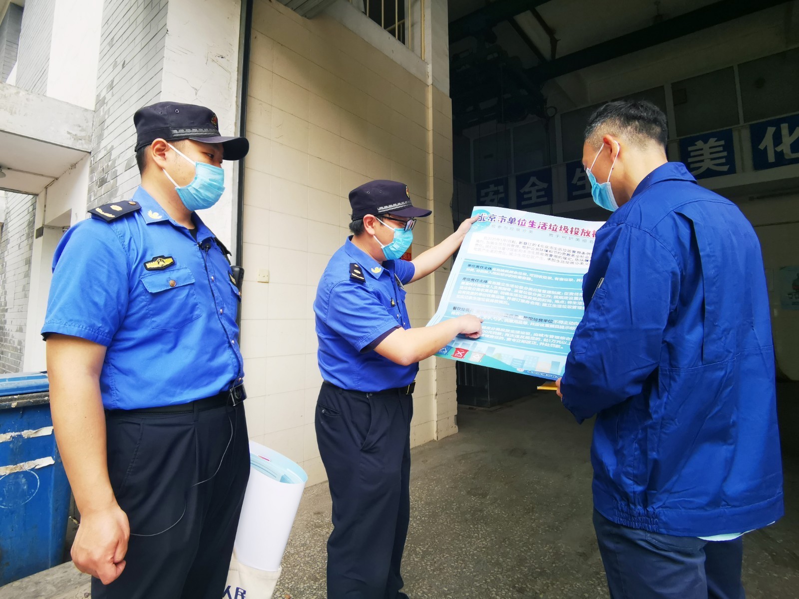 今天上午,记者跟随西城区白纸坊街道城管执法队对辖区内的企业和社区开展垃圾分类检查。经过测量体温和登记后,城管队员来到辖区某企业垃圾楼内,耐心询问该企业垃圾分类工作落实情况。你们来得太及时了,我们自己在网上看了好多垃圾分类的介绍,可到这个具体分类的时候,又遇着好多不清楚的地儿,该企业垃圾分类负责人说。您看,按照咱们企业的需要,这里您需要设置四种颜色的垃圾分类桶,这里能够处理的就是咱们的生活垃圾,其他的位置可以根据企业的实际情况按需设置垃圾桶。如何分类您可以参考这个宣传折页上的内容,但是如果是您这里生产产生的工业垃圾就不能这样处理了。城管队员指着宣传折页介绍道。