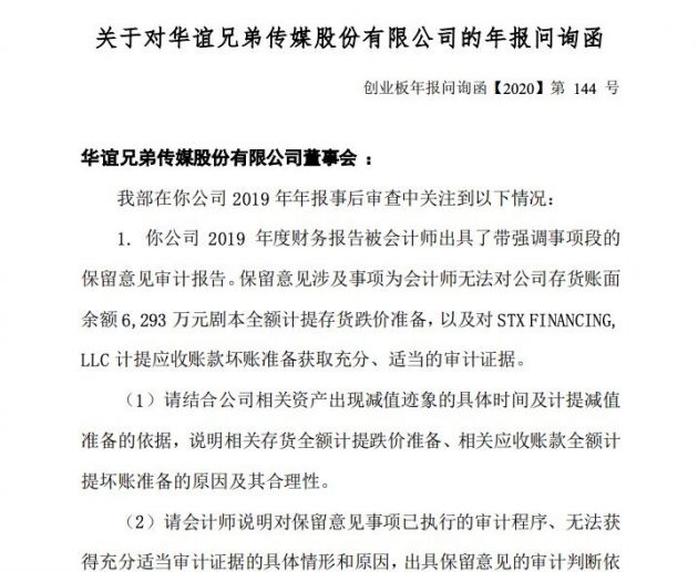 华谊兄弟问询函 要求就账款、营收、经营等问题展