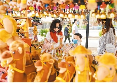 “五一”假期,甘肃省敦煌市在做好疫情防控的前提下,有序开放部分旅游场所。图为在敦煌市鸣沙山月牙泉景区门口,游客们正在挑选当地特色小商品,欢度假日。