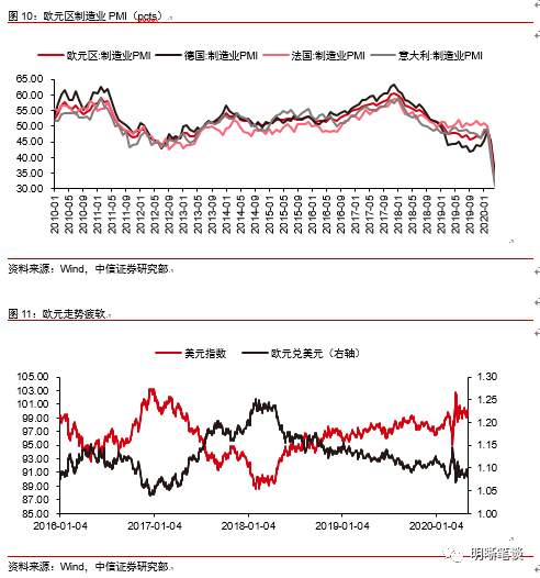 从持续性的角度来看,我们认为当前由于避险情绪上升带来的美元强势相较于3月份的美元流动性紧缺持续性更强,在强美元的背景下人民币的贬值压力也具有一定持续性。从利率平价的角度,国内货币政策落地的幅度和时间将受到影响,因此当前债市受到比较大的扰动。从持续性的角度来看,我们认为当前由于避险情绪上升带来的美元强势相较于3月份的美元流动性紧缺持续性更强。3月份美元走强伴随着美联储无限量QE的推出,美元流动性紧张局面有所好转,目前美联储仍未退出宽松政策。而从当前情况来看,新冠疫情给全球经济带来了极大的不确定性,欧元区作为新冠疫情的重灾区,4月份欧元区整体与德国、法国、意大利三大经济体均经历了经济的大幅下滑,同时欧元区的债务问题也令人担忧。欧元区基本面情况使得欧元走势疲软,欧元作为美元指数权重占比最高的货币,对于美元指数维持高位有所支撑,因此在强美元的背景下人民币的贬值压力也具有一定的持续性。从利率平价的角度,人民币表现的疲软使得国内货币政策落地的幅度和时间将受到影响,因此当前债市受到比较大的扰动。