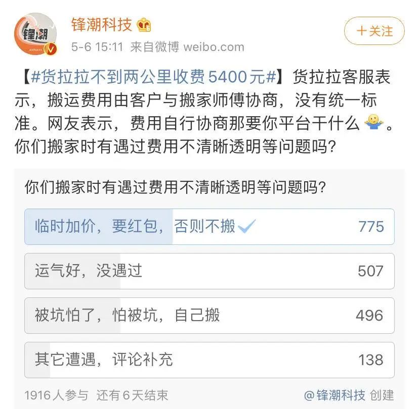 峰潮科技发布的一项投票活动结果显示,超过四成用户在搬家时遇到过临时加价要红包,否则不搬的情况,近三成用户由于被坑怕了,怕被坑,自己搬。
