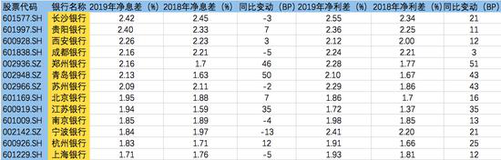根据澎湃新闻梳理,净利差方面,13家A股上市城商行中,2019年,长沙银行的净利差最高,达到2.55%,江苏银行净利差最低,为1.72%;相对于2018年,这13家城商行净利差均上升,其中郑州银行、青岛银行、苏州银行净利差增幅较大,分别增加了51BP(基点,下同)、43BP、43BP。净息差方面,13家城商行中,有6家城商行净息差较上年下降。