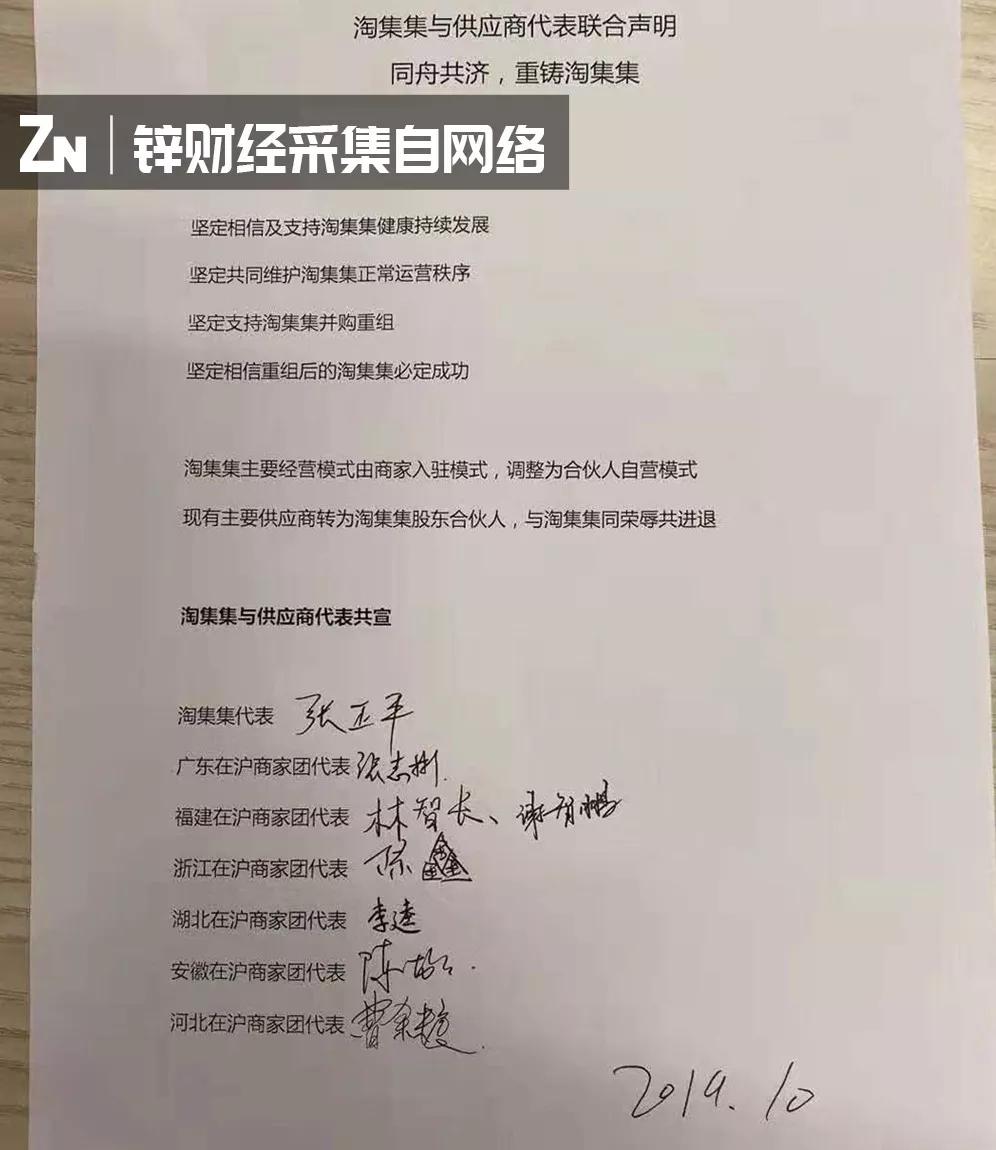 最后,冯鹫与其他7名代表共同发表了联合声明,支持淘集集的债务重组和债转股,支持淘集集从商家入驻模式,调整为合伙人自营模式,现有主要供应商转为淘集集股东合伙人,表示与淘集集同荣辱共进退。