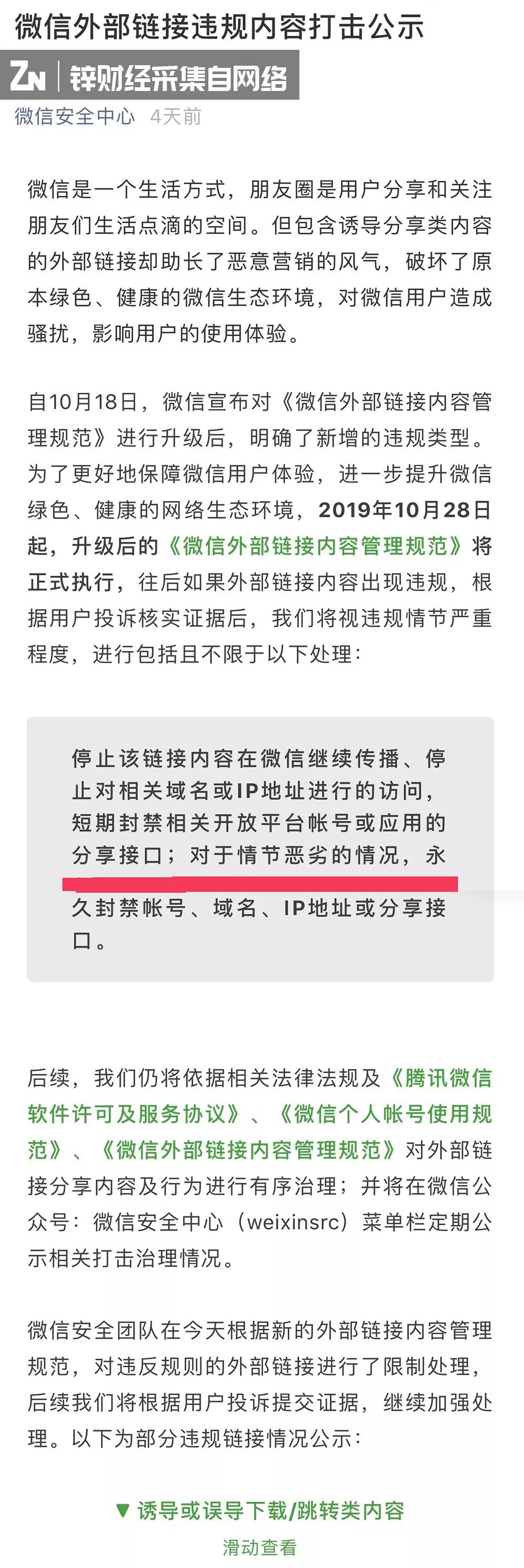 10月18日微信官方对《微信外部链接内容管理规范》进行修订,因为不少微信用户反应受到拼团等营销活动的骚扰,用户体验下降,禁止部分拼团砍价营销,如砍一刀、帮我加速吧,这类好友助力、加速、砍价等,都被微信列入违规活动。