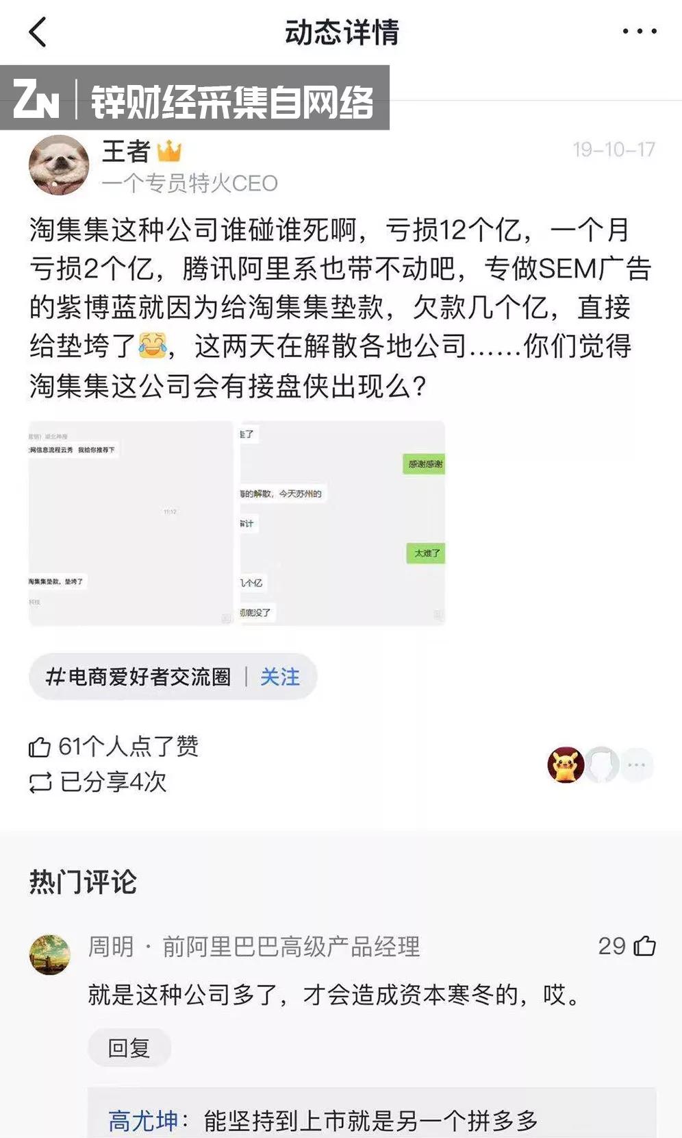 脉脉上有消息称,专做SEM广告的广告公司紫博蓝,负责淘集集的广告营销,因为给淘集集垫款,公司面临解散。锌财经询问紫博蓝相关人士,截止到发稿日仍未回复。