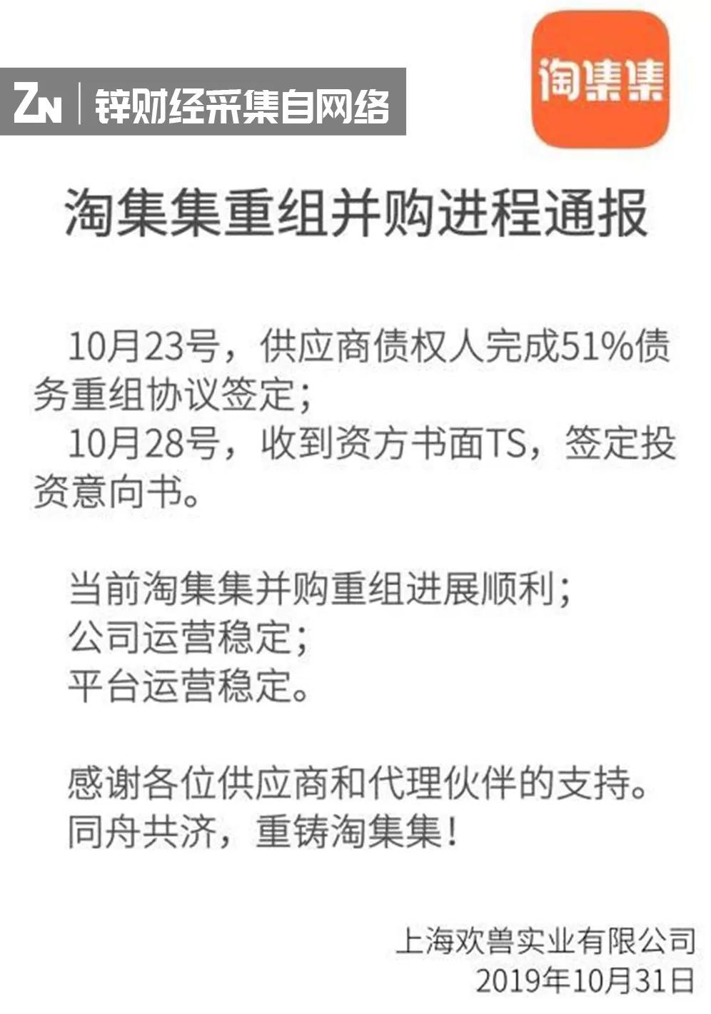 10月31日,淘集集官方发布重组并购进程通报内容是:“10月23号,供应商债权人完成51%债务重组协议签定;10月28号,收到资方书面TS,签定投资意向书。当前淘集集并购重组进展顺利;公司运营稳定;平台运营稳定。”这意味着在23号,51%的商家同意与淘集集签订债务重组协议,5天后拿到资方的投资意向书,债务重组的速度高于业界预期。