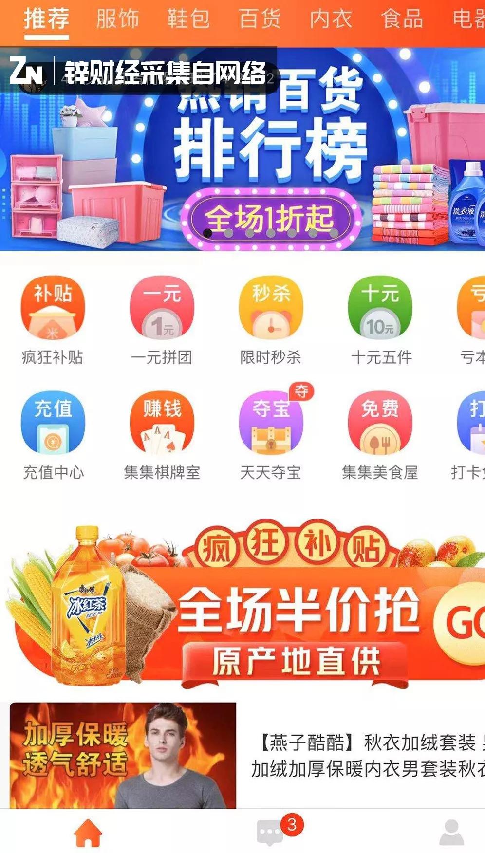 “百货、服装全场1折起”“超级周末3元起,一站购齐,全场补贴一半。”淘集集首页上正在推出各式促销活动。