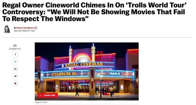 如今,美国第二大院线Regal加入了第一大院线AMC的行列,也发布声明严厉抨击环球影业,认为其在新冠疫情导致院线关门的艰难时刻单方面打破了窗口期,是不正当。AMC发声表示将不再放映任何环球影业电影,环球待映或制作中的新片有《007:择日赴死》《速度与激情9》《侏罗纪世界3》《小黄人大眼萌2》等。