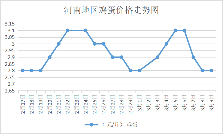 3月10日,河南荥阳鸡蛋2.8元/斤,稳;中牟鸡蛋2.8元/斤,稳;周口鸡蛋2.8元/斤,稳;商丘鸡蛋85元/30斤,稳;鹤壁鸡蛋2.8元/斤,稳;汝州鸡蛋2.95元/斤,稳;开封鸡蛋85-87元/30斤,稳;漯河鸡蛋2.9元/斤,稳;漯河临颍鸡蛋2.9元/斤,稳;许昌鸡蛋2.9元/斤,稳;南阳鸡蛋2.8元/斤,稳;南阳邓州鸡蛋2.8元/斤,稳;新乡鸡蛋2.8元/斤,稳;安阳鸡蛋2.8元/斤,稳;新郑鸡蛋2.8元/斤,稳;登封鸡蛋2.8元/斤,稳;平顶山鸡蛋2.95元/斤,稳;驻马店鸡蛋2.9元/斤,稳;三门峡鸡蛋2.9元/斤,稳;焦作鸡蛋2.8元/斤,稳;信阳鸡蛋2.8元/斤,稳;濮阳鸡蛋2.8元/斤,稳。