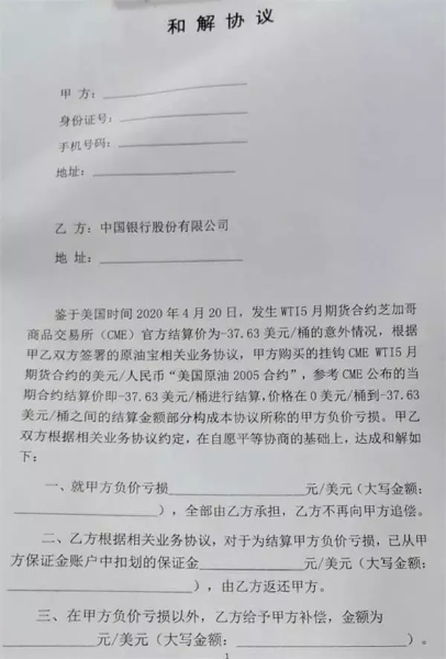 此公告一发出,不少原油宝投资人就表示,已经收到了中行员工的电话,邀请投资者当面商讨赔偿方案、签订赔偿协议。虽然协议上写着保密、不允许告诉第三方,但如今这份协议早已不是秘密。