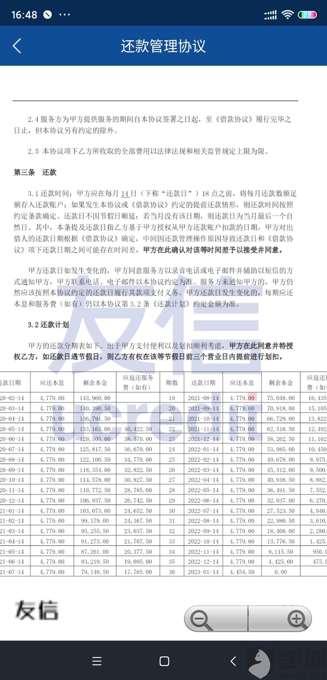 消费者“匿名”在5月9日向黑猫投诉平台反映:“从2020年1月14日成功在友信借款实际到账10万元,但后台合同是147***元,47500元是他们所谓的服务费,至于这个服务费具体是做什么用的他们客服也无法解释,多次找办理贷款的业务员咨询借款金额问题她承认借款金额是10万元。现在每月还款等额本息4779元,一共36期,已经还了4期。算下来3年总共需要还清171***元,由于超过国家规定利息,属于严重不合法高利贷。我要求原合同终止归还剩余合法本金。”
