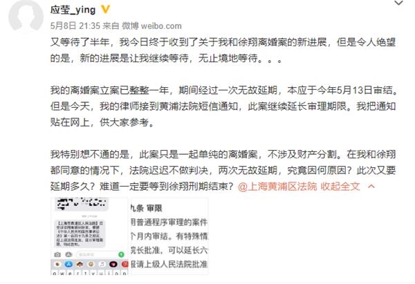 昨夜九点半,应莹发微博称收到黄浦法院短信通知,徐翔离婚案继续延长审理期限。